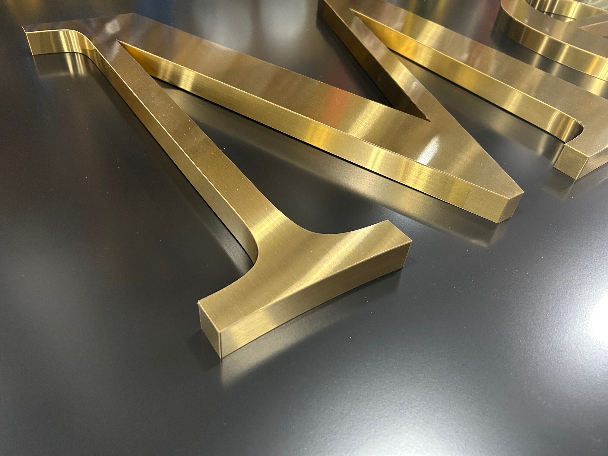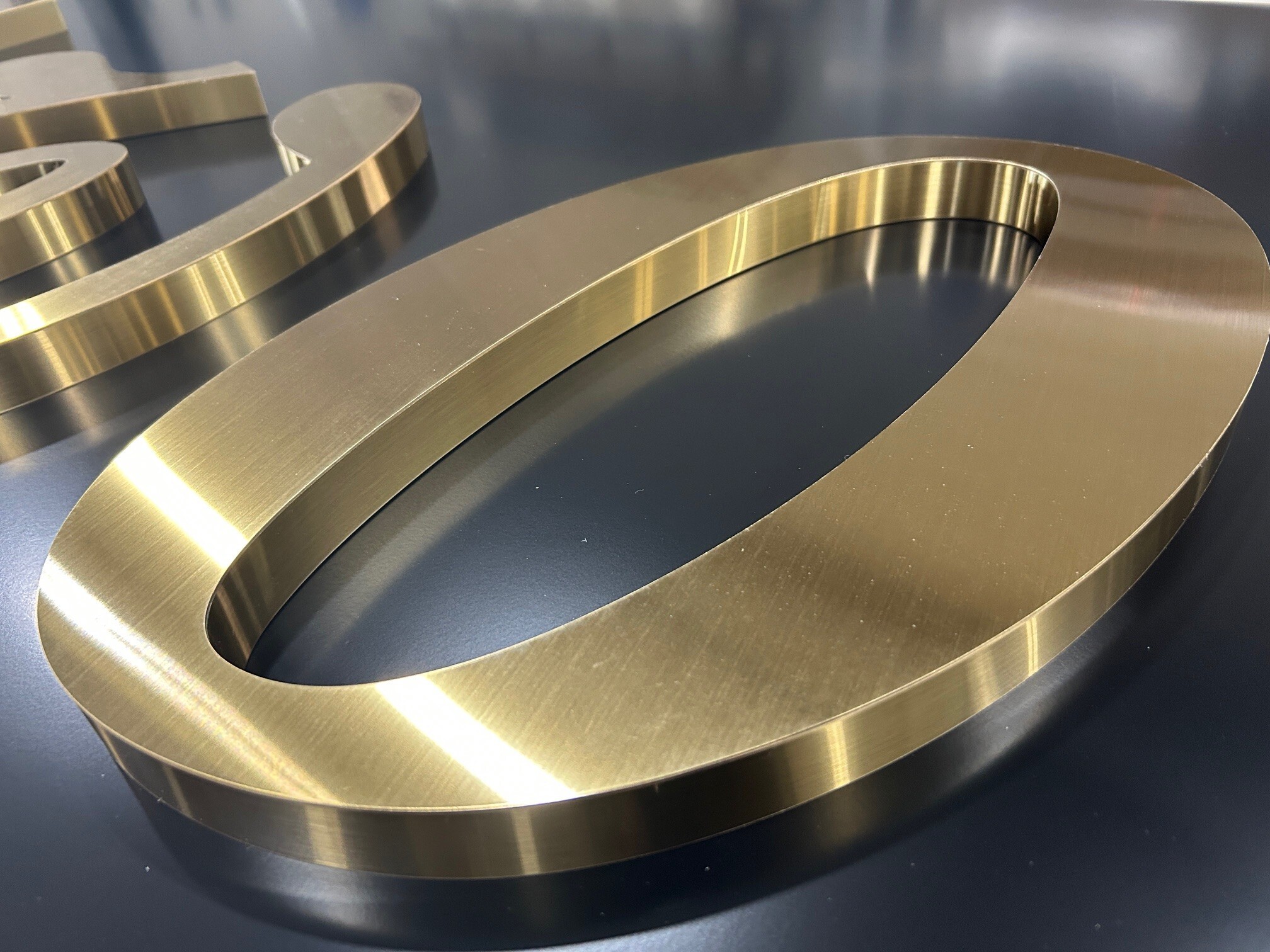 To achieve the upscale look and ensure long-term durability, we recommended fabricated titanium letters with a brushed gold finish. As part of our process, we produced finished samples of the titanium letters for the client to review and approve before moving into full production.